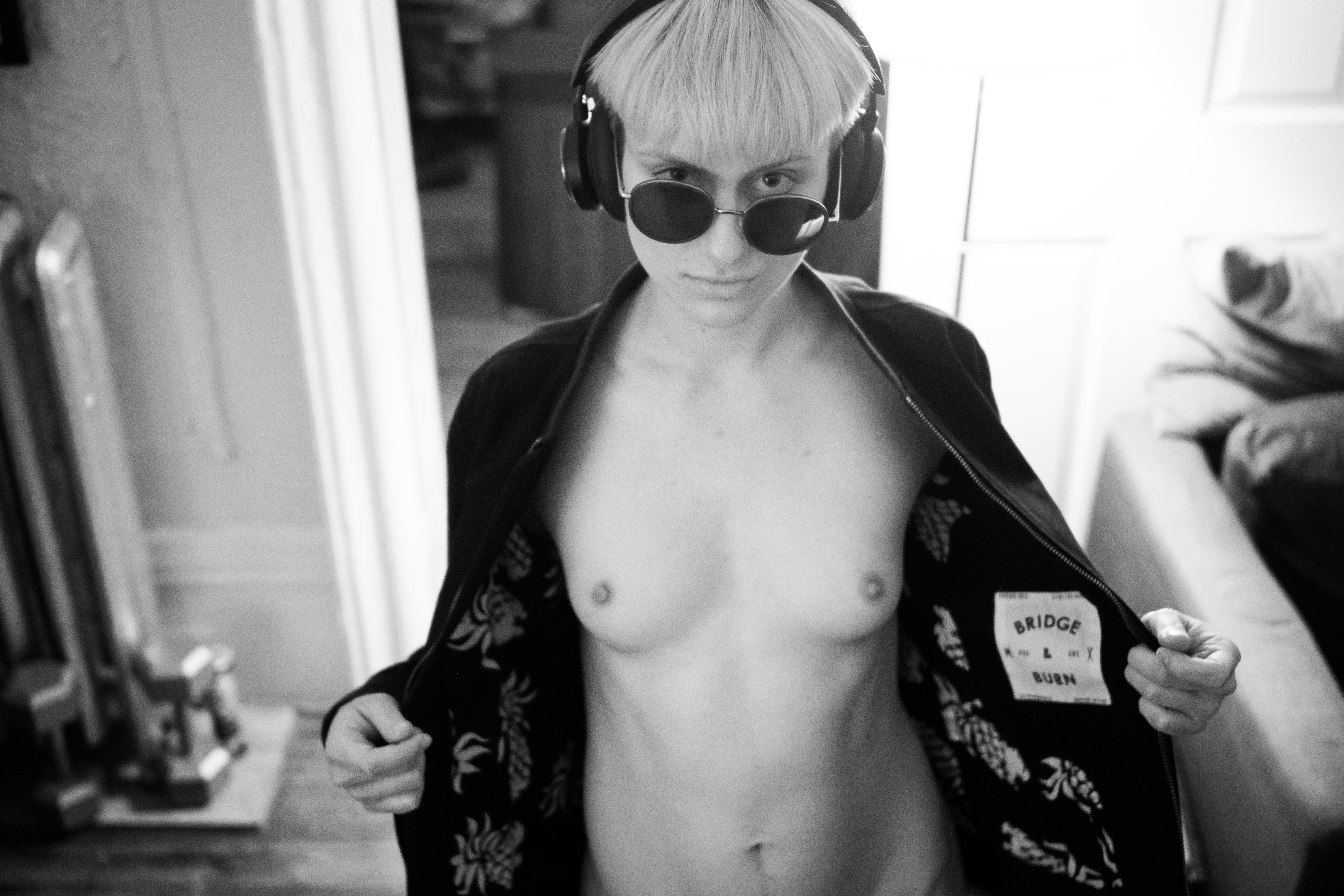In a striking monochrome photograph, a subject confidently reveals their bare torso while wearing oversized headphones and sunglasses. The intimate indoor setting, highlighted by soft lighting, contrasts with the subject's bold demeanor, creating a mood of both vulnerability and defiance. The composition draws the eye to their direct gaze, inviting contemplation of identity and style.