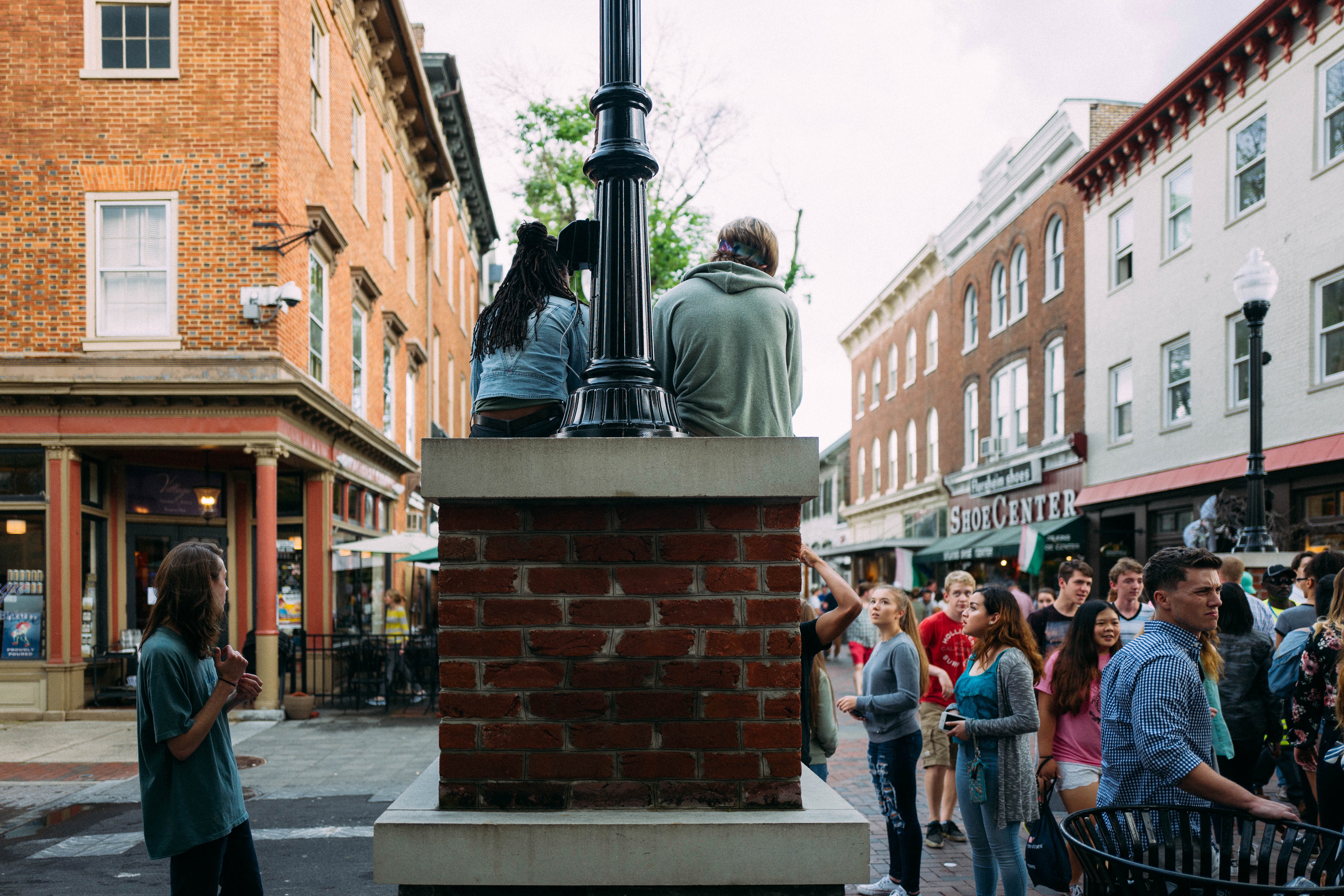In a lively urban scene, two young people perch on a brick pillar, their casual attire contrasting with the bustling crowd below. The warm afternoon light casts soft shadows, enhancing the camaraderie among the group as they engage in animated conversations, embodying a vibrant youthful spirit. The composition draws the eye upward, connecting the relaxed figures above with the energetic crowd surrounding them.