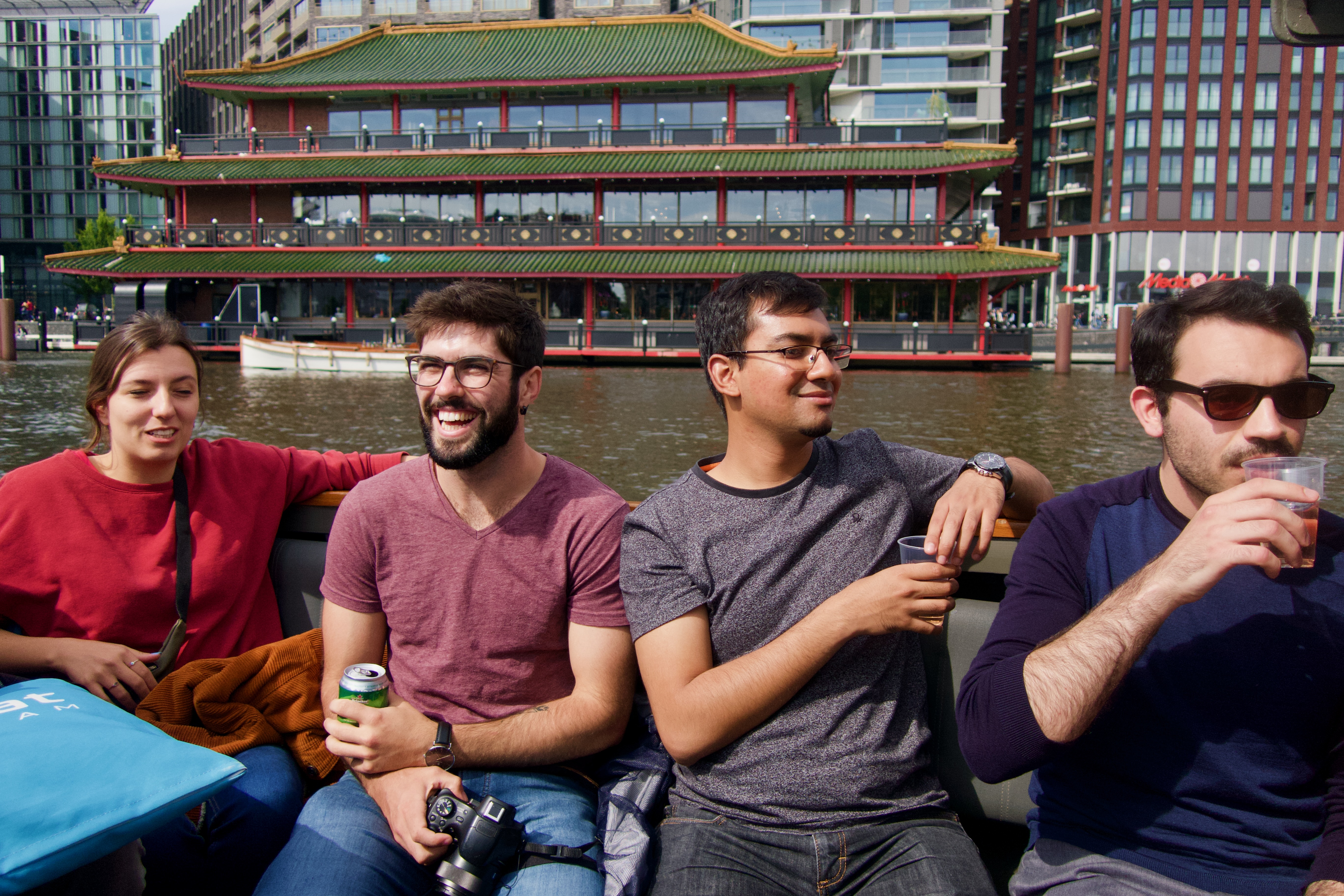 A group of friends enjoys a sunny day on a boat, their laughter and camaraderie radiating warmth. The vibrant backdrop of an ornate building reflects a mix of cultures, enhancing the lively mood. Soft, natural light illuminates their faces, creating a casual and inviting atmosphere.