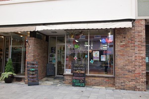 This photograph captures a cozy coffee shop exterior, characterized by its inviting display of vibrant signage advertising various beverages and specials. The warm, natural light enhances the brick facade, creating a welcoming atmosphere that invites passersby to explore. Potted plants frame the entrance, adding a touch of greenery and life to the urban setting.