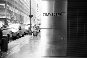 The photograph captures a monochrome city scene during a rainy day, highlighting a sleek metallic wall with the word 'TRAVELERS' prominently displayed. In the background, blurred figures navigate the wet streets, their umbrellas and raincoats enhancing the somber yet contemplative mood. The composition balances the urban architecture with the organic movements of people, evoking a sense of community amidst solitude.
