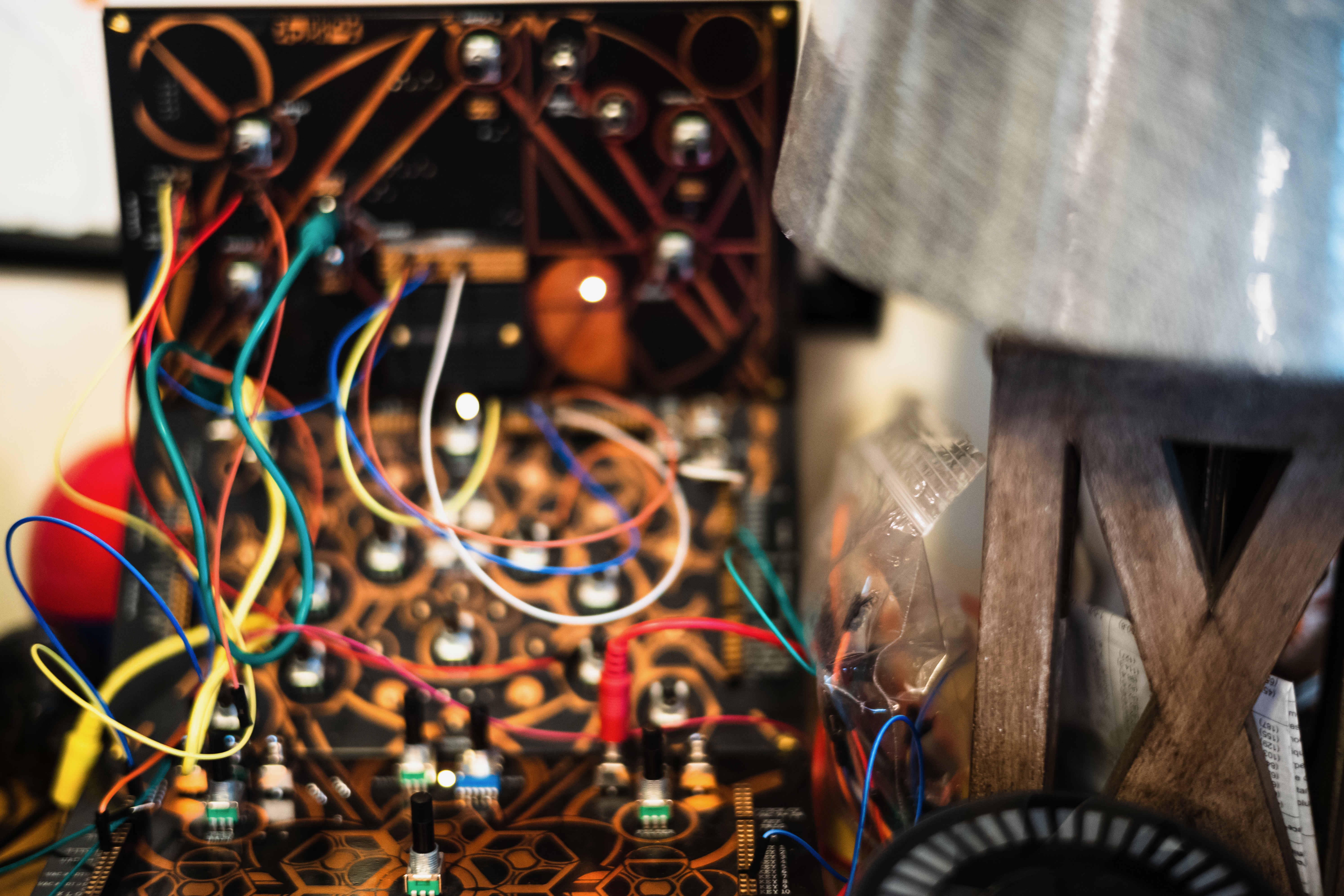 This photograph captures a close-up of a complex array of electronic components, showcasing vibrant wires entangled amidst an intricately designed circuit board. The ambient lighting creates a warm, inviting glow, hinting at a cozy yet focused workspace filled with creativity and technology. The composition emphasizes the chaotic beauty of the setup, drawing the viewer into a world of sound and innovation.