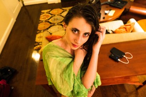 The photograph captures a contemplative figure draped in a translucent green garment, evoking a mood of vulnerability and introspection. Rich wooden tones and warm ambient lighting create a cozy atmosphere, while the subject's piercing gaze draws the viewer in. The composition, seen from an elevated angle, adds a sense of intimacy and allure to the scene, contrasting with the casual clutter of the room.
