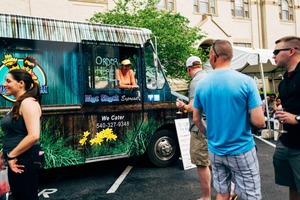 The image captures a vibrant food truck scene, bustling with energy as customers engage with a cheerful server. Sunlight filters through the trees, casting a lively glow over the gathering, while the truck's rustic decor and bright colors evoke a warm, inviting atmosphere. With a mix of casual diners and outdoor festivities, the photo embodies a joyful, communal spirit around food and connection.