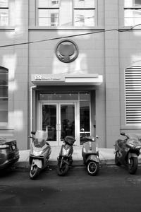 The photograph captures a simple yet striking façade of a building, highlighted by the bold '88 COLIN P KELLY' sign above the entrance. The composition is anchored by a row of parked scooters that adds a layer of urban charm, contrasting with the monochrome palette. Soft shadows dance across the walls, creating a serene mood that invites exploration of this quiet city corner.