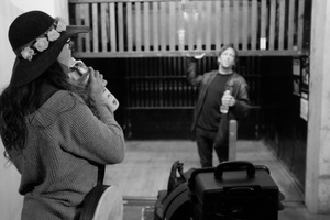 In a dimly lit space, a woman in a wide-brimmed hat takes a sip from her bottle, her profile illuminated by the soft glow of the surroundings. Across from her, a man leans casually against a barrier, creating a sense of relaxed intimacy amid the stark contrasts of black and white. The composition captures a fleeting moment of connection, evoking a blend of nostalgia and candid intimacy.