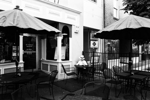 In a charming café setting, a solitary figure dressed in white sits at a table beneath a dark umbrella, engrossed in contemplation. The black and white aesthetic enhances the mood of tranquility, evoking a sense of nostalgia and introspection. The composition cleverly frames the subject against the backdrop of the café, with empty chairs suggesting a pause in time.