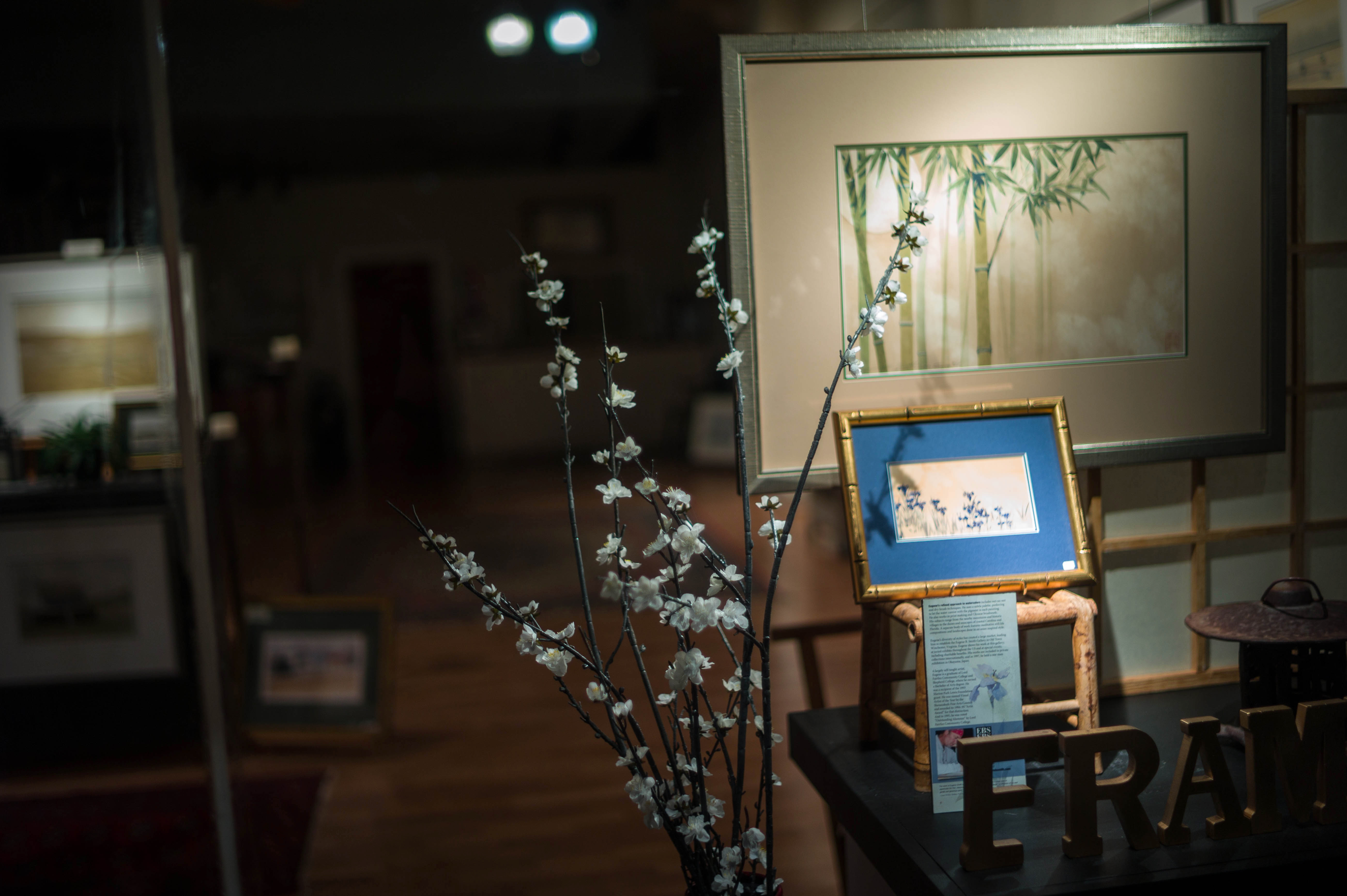This photograph captures a serene art gallery scene, with delicate white blossoms in the foreground contrasting against vibrant framed artworks in the background. Warm lighting creates an inviting atmosphere, enhancing the rich wooden textures of the gallery space. The composition draws the eye from the floral details to the art, inviting contemplation and appreciation for both nature and creativity.