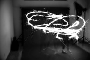 The photograph captures a dynamic swirl of bright, sparking light drawn against a darkened backdrop, creating an ethereal, almost dreamlike quality. The blurred figures hint at movement, adding to the whimsical and energetic mood. The contrast between the illuminated lines and the shadowy surroundings evokes a sense of magic and spontaneity in the scene.