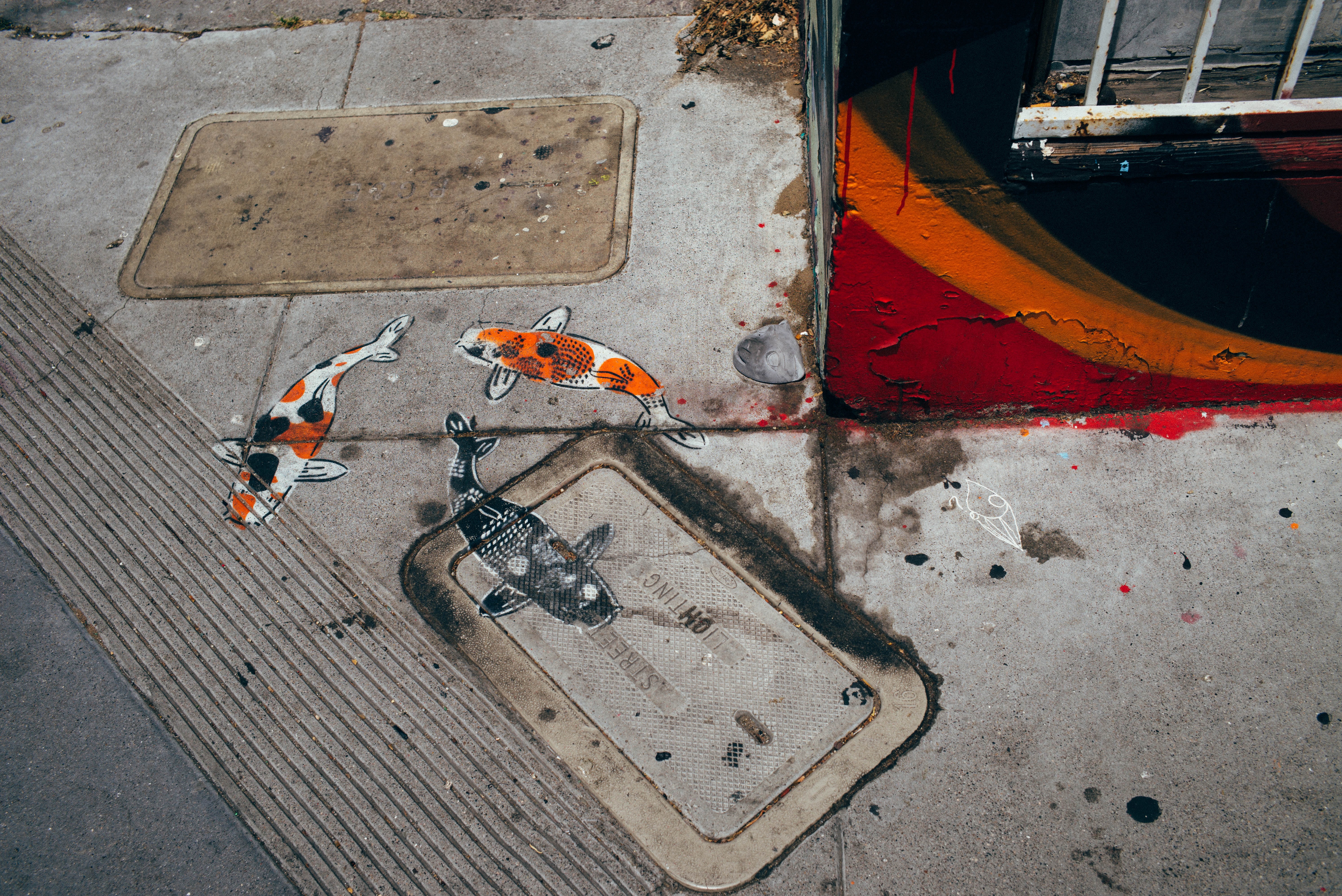 This photograph captures a vibrant street scene where colorful koi fish have been artistically painted on the concrete, creating a playful illusion of movement on the sidewalk. The warm, dappled lighting adds a sunny, cheerful mood, while the surrounding urban elements suggest an intriguing contrast between nature and city life. The composition draws the eye along the path of the fish, inviting viewers to explore this unexpected splash of creativity in an everyday environment.