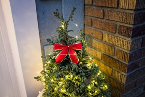 A small evergreen tree adorned with golden fairy lights and a vibrant red bow exudes warmth and cheer, capturing the essence of the holiday spirit. The soft glow of the lights contrasts beautifully with the textured brick backdrop, creating an inviting atmosphere. This cozy scene invites passersby to pause and appreciate the joy of the season.