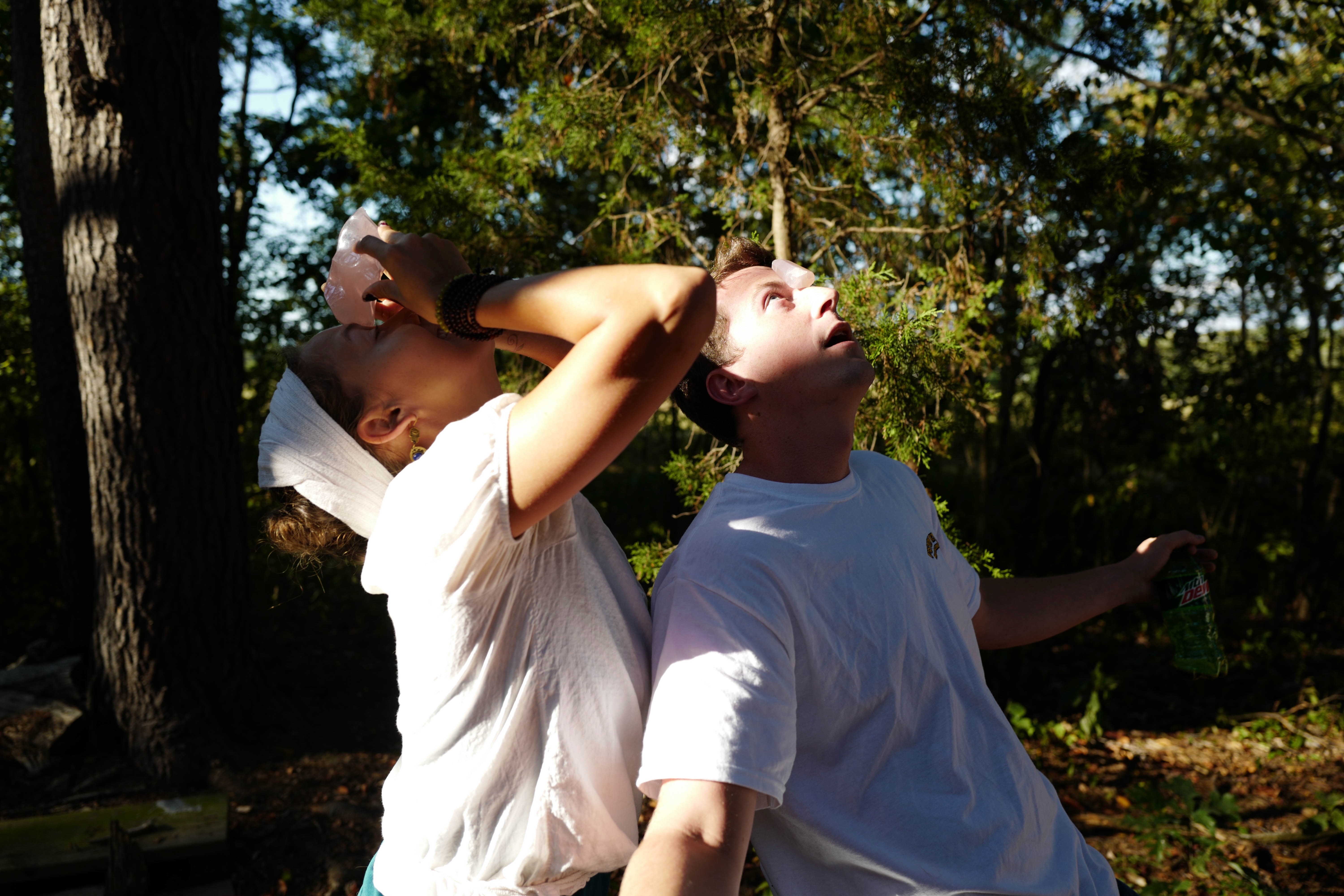 A moment of carefree joy captures two young adults in a playful challenge beneath sunlit trees. The vibrant light streaming through the foliage casts a warm glow, highlighting their expressions of excitement and astonishment. The composition emphasizes their dynamic poses, creating a sense of spontaneity and fun in the great outdoors.