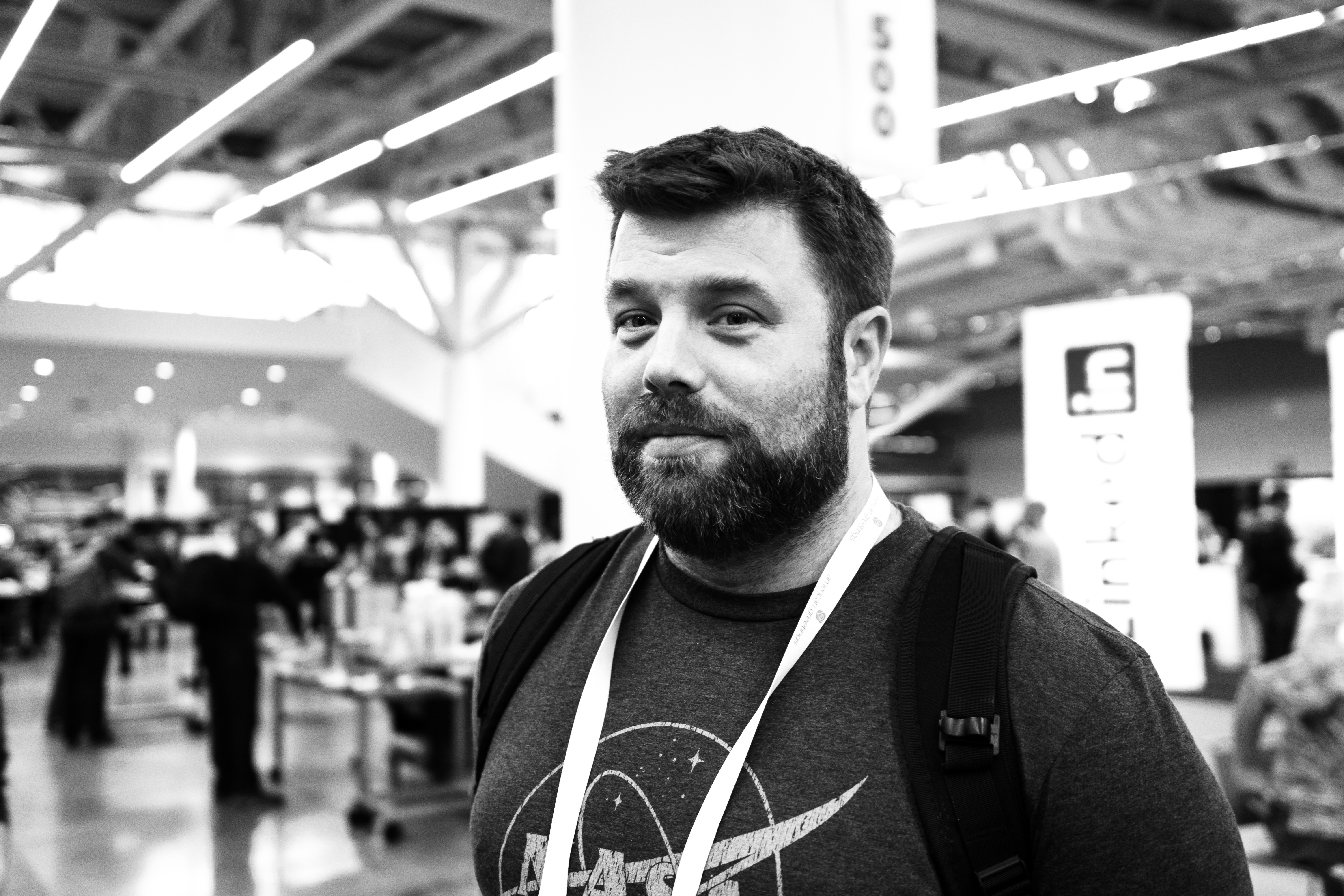 The photograph captures a man with a beard, standing amidst a bustling event. The high-contrast black-and-white composition emphasizes his thoughtful expression, while the blurred background hints at a lively atmosphere filled with activity. The soft lighting enhances the mood, creating an intimate focus on the subject against the dynamic backdrop.