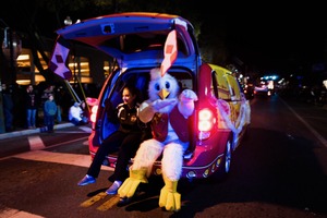In the glow of a vibrant night parade, a cheerful character in a chicken costume lounges playfully in the back of a brightly-painted vehicle. The lighting casts a warm ambiance, contrasting with the deep blue hues of the evening sky, while a nearby crowd watches, hinting at a festive atmosphere brimming with excitement and joy. The composition centers on the playful dynamic between the performer and the casual observers, encapsulating the spirit of celebration.