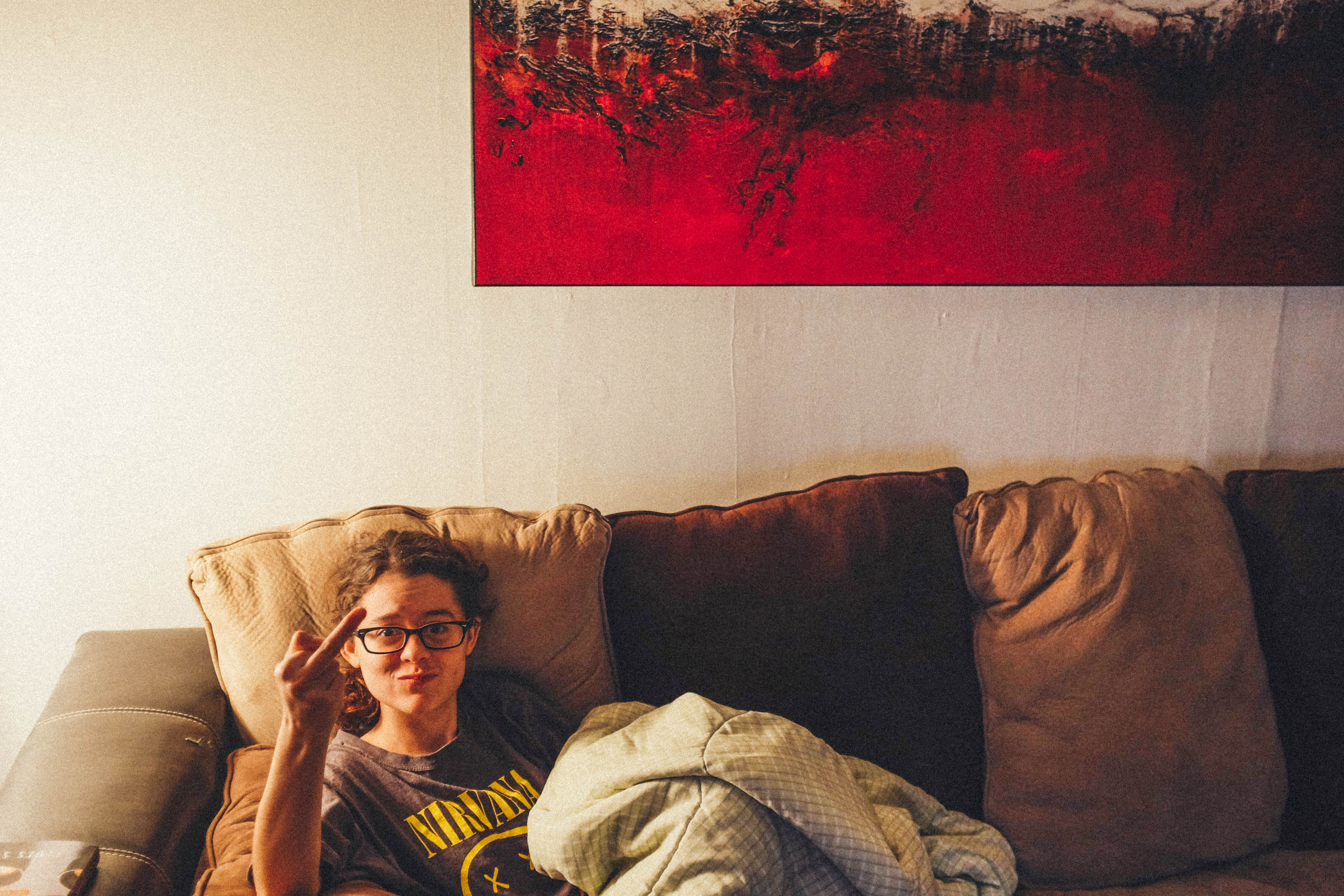 In a cozy living room, a person lounges on a sofa, exuding a playful yet rebellious spirit with a cheeky gesture. Soft, warm lighting envelops the scene, highlighting the relaxed atmosphere while vibrant red art on the wall adds a dash of drama. The inviting texture of the couch juxtaposes with the boldness of the subject, creating a striking visual contrast.