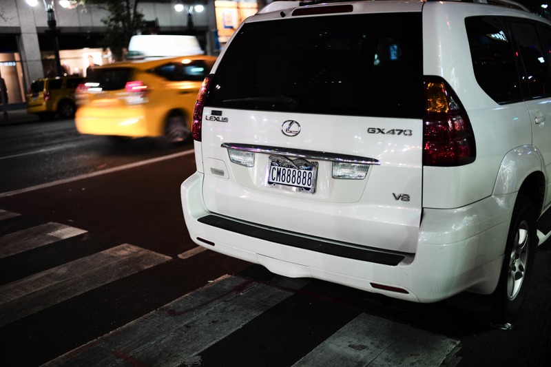 A white Lexus SUV stands prominently in the foreground, partially obstructing a crosswalk, while blurred yellow taxis weave by in the dimly-lit street. The photograph captures a sense of bustling urban life, contrasting the stationary vehicle against the motion of the city. Soft lighting from nearby storefronts reflects on the vehicle's surfaces, creating an atmospheric evening mood.