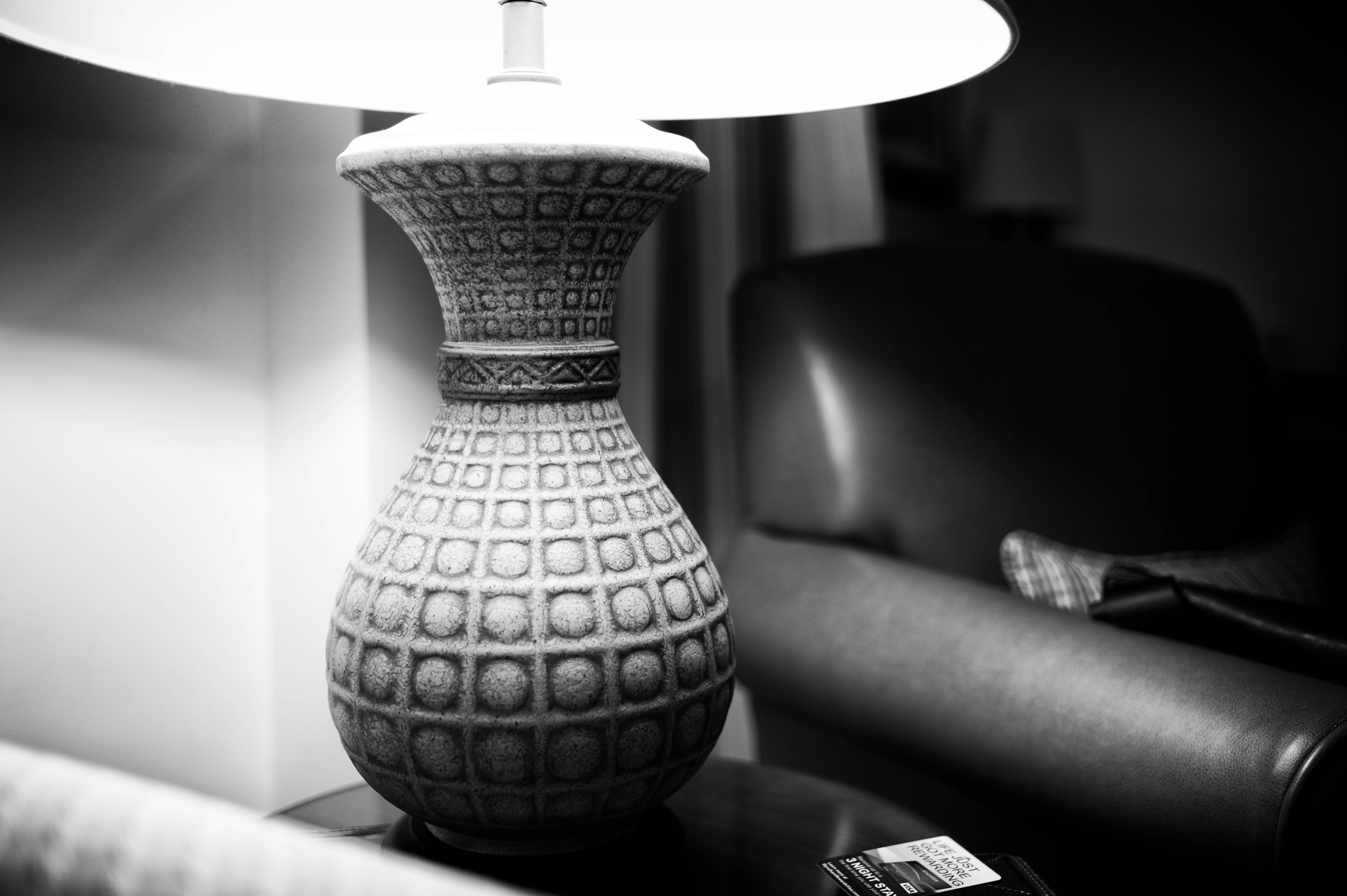 The photograph captures a textured lamp, its unique design accentuated by the gentle glow of the shade. The monochrome palette adds a timeless elegance, creating a serene, contemplative mood. Soft shadows enhance the composition, drawing the eye to the intricate details of the lamp amidst a cozy setting.