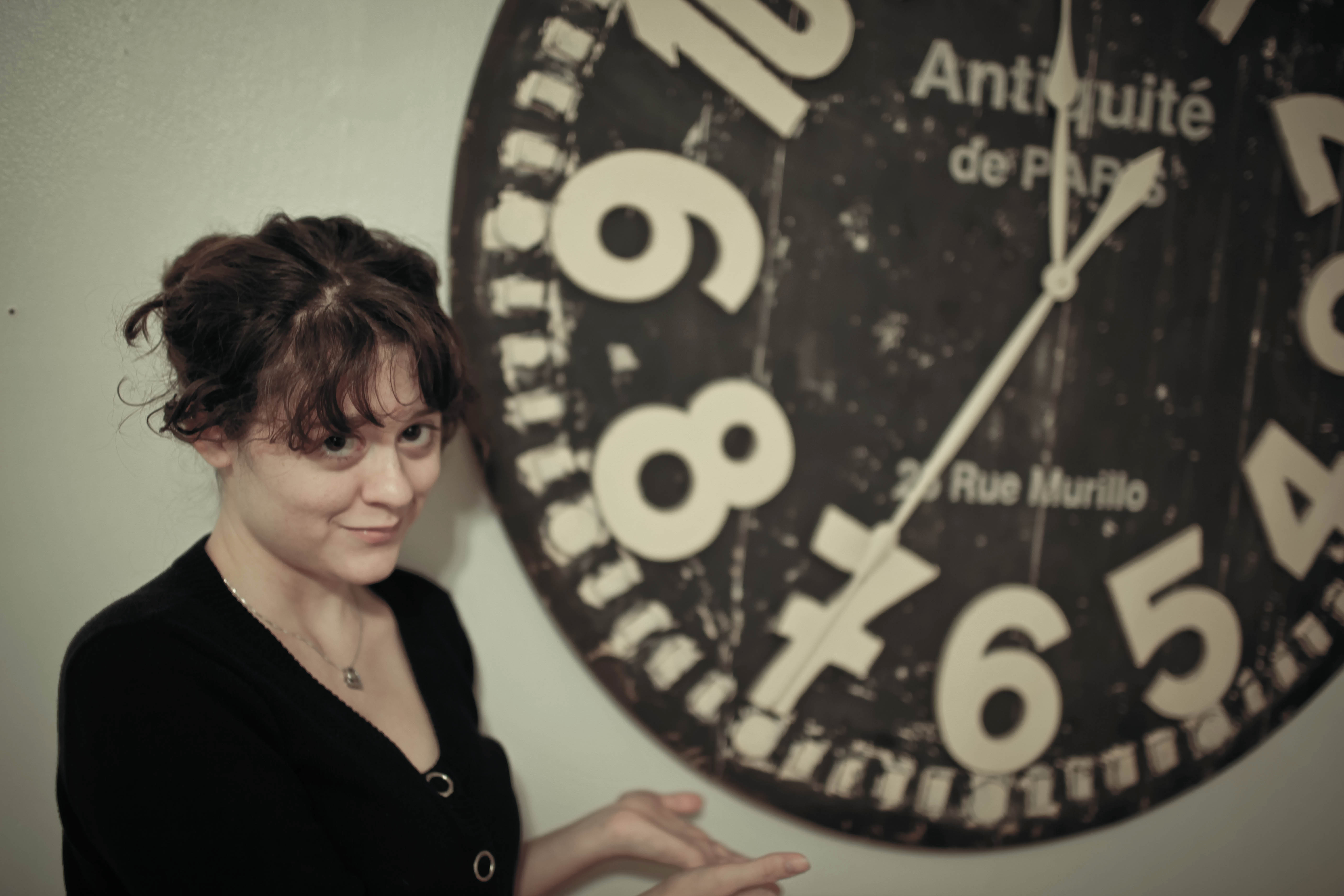 A young woman with playful charm stands beside a large, vintage clock, exuding an air of curiosity. The soft, diffused lighting enhances the warm tones of her expression and the rustic clockface, creating a cozy atmosphere. The contrast between her features and the clock draws the eye, inviting contemplation on the passage of time.