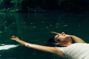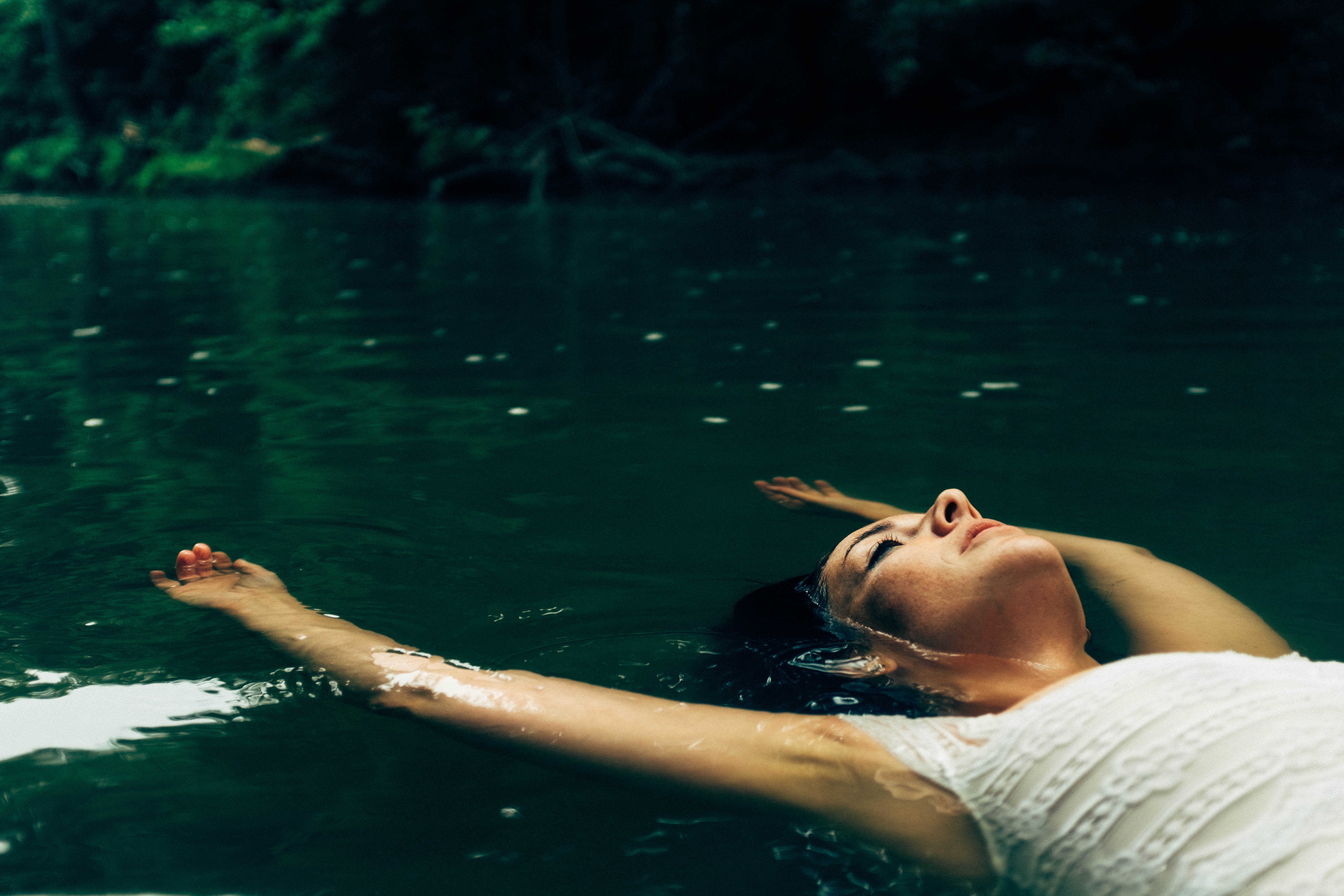 A woman floats serenely in a tranquil body of water, exuding a sense of calm and introspection. The soft, diffused light illuminates her relaxed features, while raindrops create mesmerizing ripples across the surface. Surrounded by lush greenery, the composition captures a moment of harmony between nature and self-reflection.