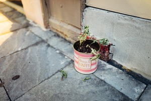 A small, faded plant struggles for life in a whimsical tin can labeled 'Always be Happy,' contrasting its wilting leaves with the cheerful message. The soft, natural lighting bathes the pavement, suggesting a sense of gentle optimism amid a neglected space. The intimate composition draws the eye to the delicate plant, evoking feelings of resilience and hope in the face of adversity.