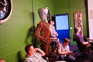 In a vibrant green room, a unique wooden figure stands silently, its artistic presence juxtaposed against the casual gathering of people. The mood is introspective, as onlookers appear absorbed in their thoughts and devices, contrasting the striking sculpture's stillness. Soft artificial lighting enhances the scene, focusing attention on the figure while creating a warm, inviting atmosphere among the seated participants.