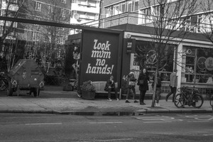 In this monochrome photograph, a diverse group of people stands outside a vibrant café adorned with a playful slogan, 'look mum no hands!' The composition captures moments of connection among pedestrians, framed by urban architecture and a hint of nature from the nearby trees. The overall mood is casual and lively, emphasized by the contrasting textures of the buildings and the inviting atmosphere of the café.