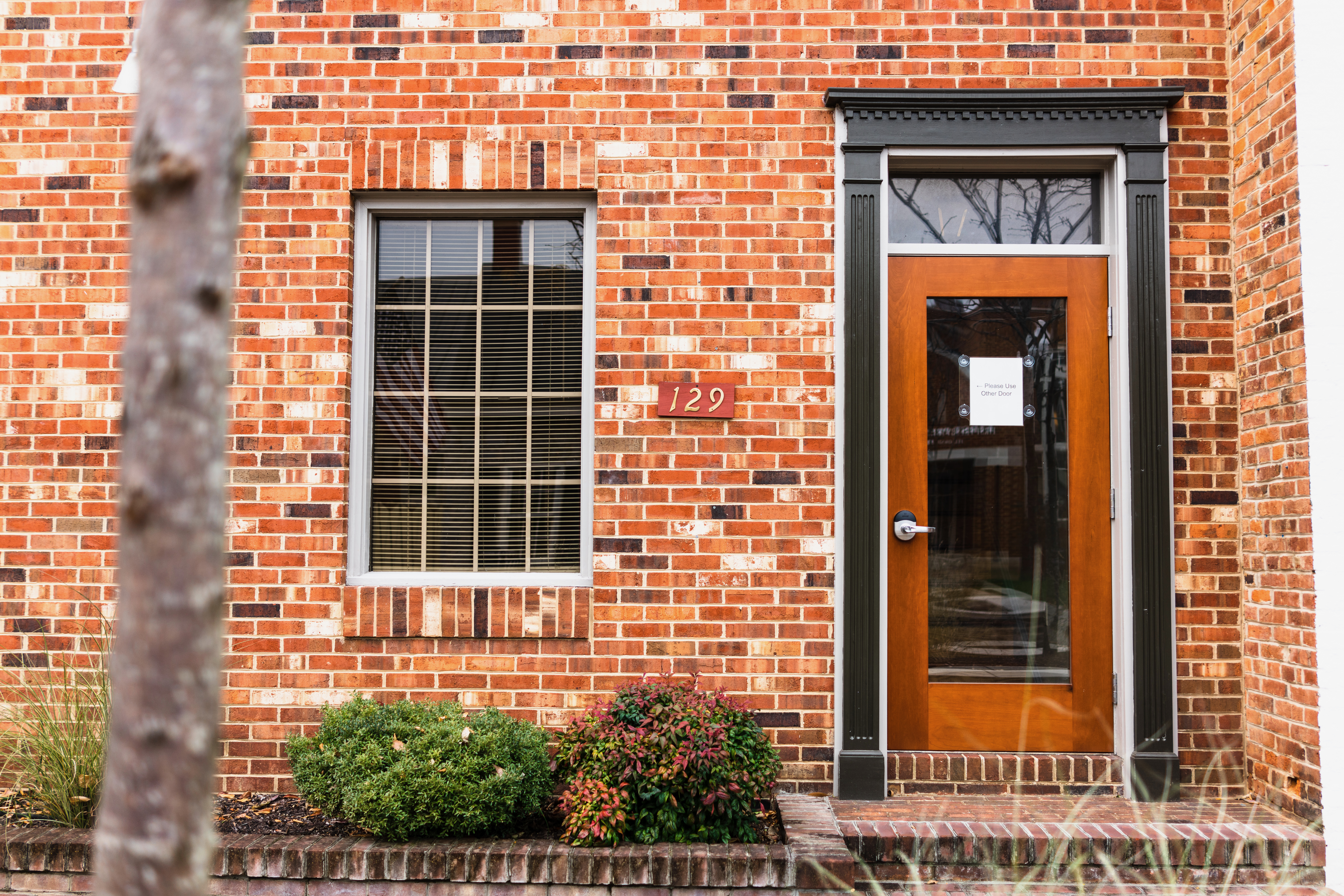 This photograph captures the inviting front of a brick building, featuring a neatly framed wooden door and a window that reflects structured lines. The warm tones of the brick contrast with the greenery below, creating a welcoming yet understated atmosphere. Soft natural light enhances the texture of the bricks, inviting curiosity about what lies inside.