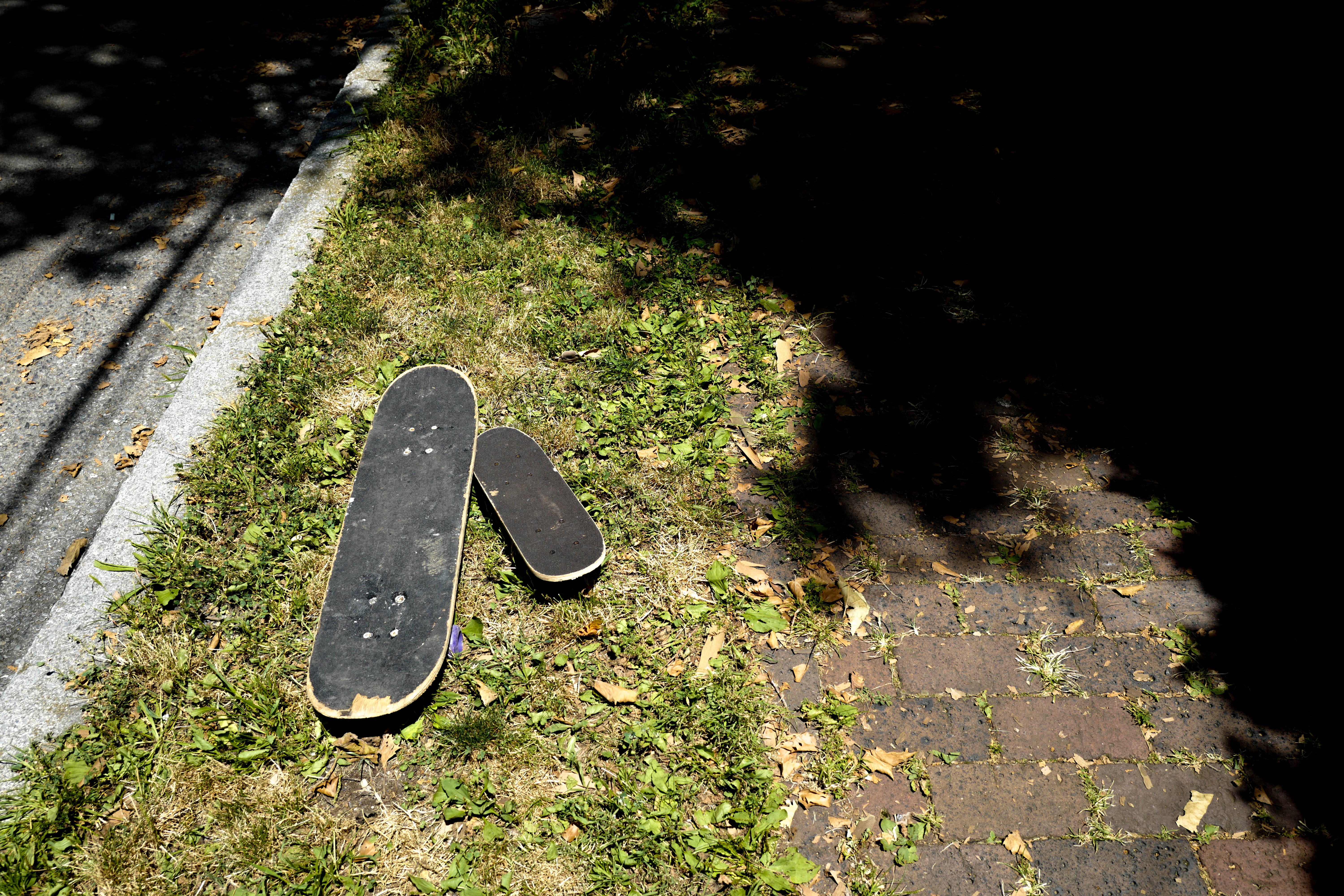 Two weathered skateboards lie abandoned on a patch of sunlit grass beside a cobblestone path. The stark contrast between light and shadow evokes a sense of nostalgia and abandonment, capturing a moment frozen in time. The scattered leaves and overgrown grass enhance the feeling of neglect and the fleeting nature of youth.
