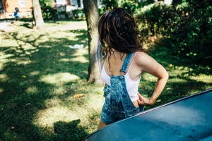 A young woman stands pensively in a sunlit backyard, her back turned toward the camera. The lush green grass and dappled light create a warm, inviting atmosphere, while her playful overalls and casual stance evoke a sense of carefree summer days. The composition highlights a moment of reflection amid nature, blending spontaneity with tranquility.