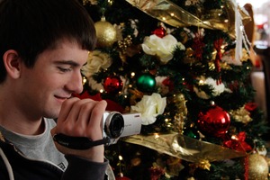 A young man is focused intently on his video camera, surrounded by the vibrant decorations of a Christmas tree. The warm lighting and rich colors of the ornaments create a festive atmosphere, while his serene expression conveys a sense of joy and nostalgia. The composition draws attention to both the subject and the sparkling holiday backdrop, merging personal engagement with seasonal celebration.