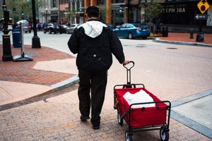 A solitary figure walks away, pulling a red wagon across a brick sidewalk in a bustling urban setting. The muted, overcast lighting casts a subdued mood, emphasizing the individual's quiet journey amid a backdrop of busy streets and storefronts. This composition captures a moment of introspection and the contrast between personal and public spaces.