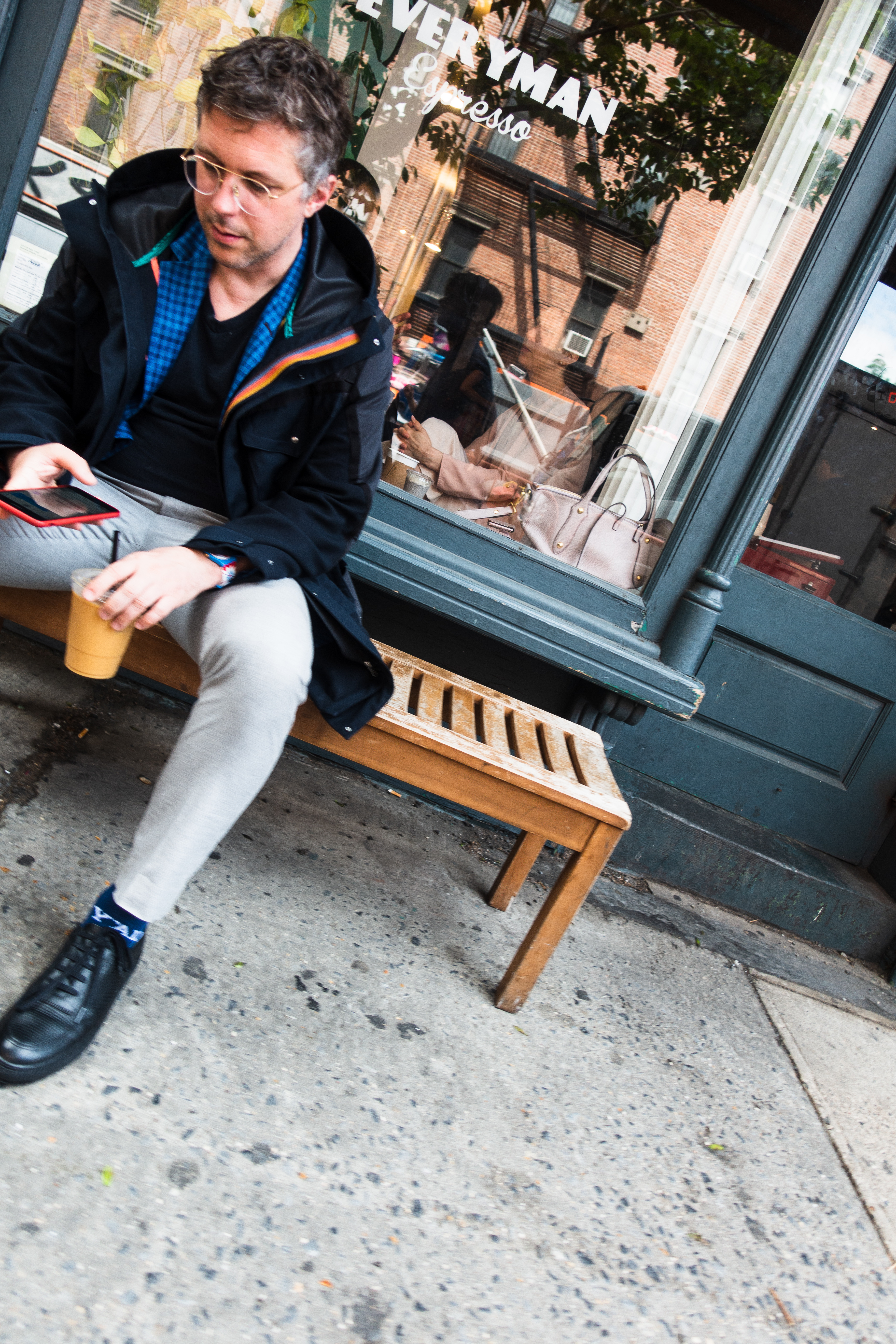 A man sits thoughtfully on a wooden bench outside a café, dressed in a stylish black jacket and casual attire. The soft morning light casts gentle shadows, creating a reflective mood as he engages with his phone, seemingly lost in thought amidst the bustling urban environment.