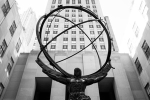 This dramatic black-and-white photograph features a towering statue of Atlas, his muscular form straining under the weight of the celestial sphere. Framed by the soaring architecture of the surrounding buildings, the composition evokes a sense of ambition and strength, while the high contrast lighting emphasizes the statue's powerful presence against the stark urban backdrop. The upward angle of the shot further amplifies the grandeur and intensity of the scene, creating a striking visual impact.