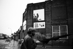 This black-and-white photograph captures a gritty urban scene, where a man holds an umbrella while walking past a graffiti-laden brick wall adorned with striking posters. The moody overcast lighting enhances the somber atmosphere, accentuating the contrasts between the textured surfaces and the figures moving through the street. The composition draws the eye from the foreground to the vibrancy of the wall, creating a narrative of urban life and artistic expression within a melancholic setting.
