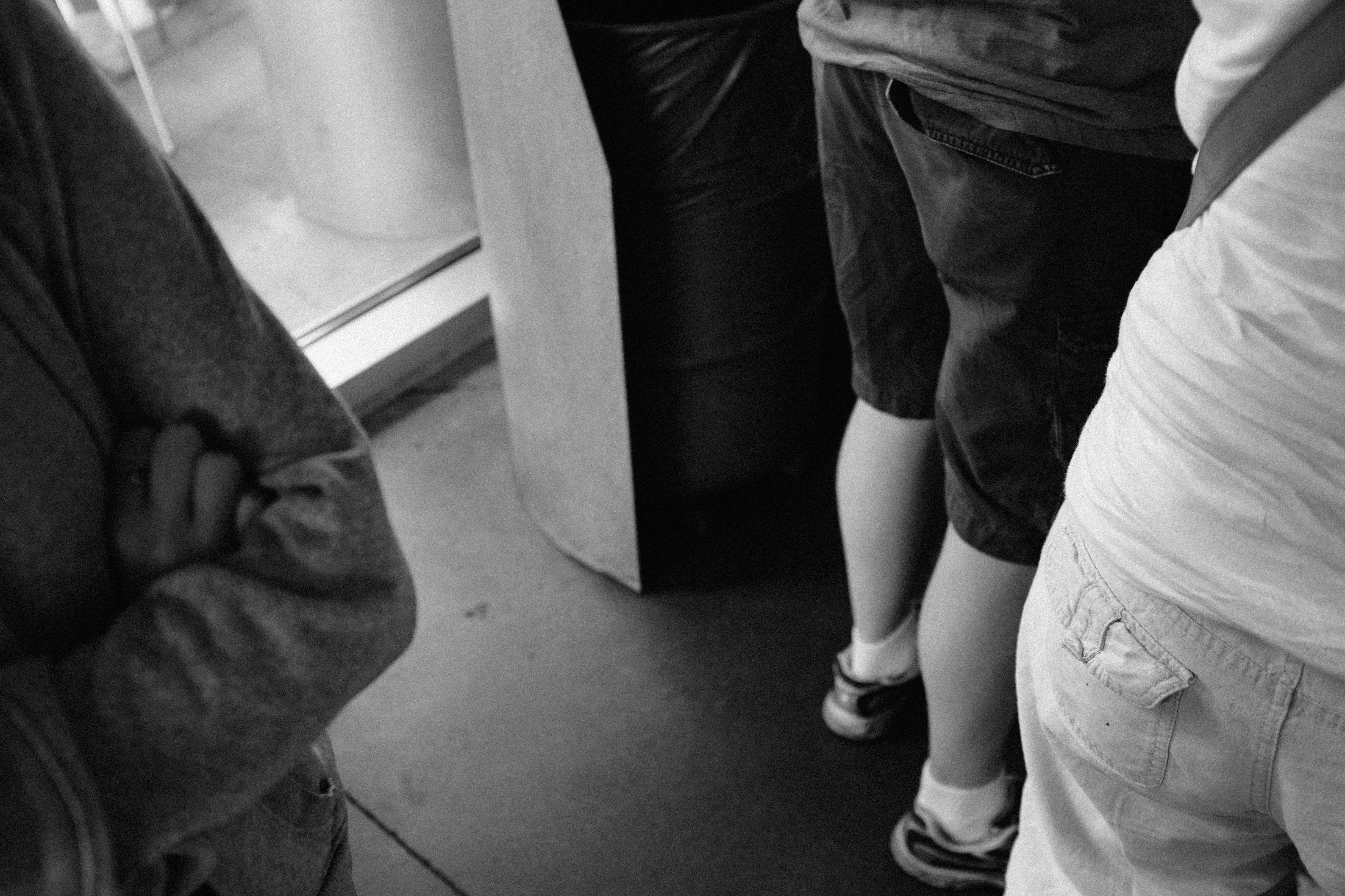 This monochromatic image captures the lower halves of several individuals standing in line, hinting at a moment of anticipation. The play of shadows and soft lighting creates an intimate yet fleeting atmosphere, allowing viewers to engage with the ordinary routine of waiting. The composition draws the eye to the contrasting textures of clothing and a hidden trash bin, adding layers of intrigue to the scene.