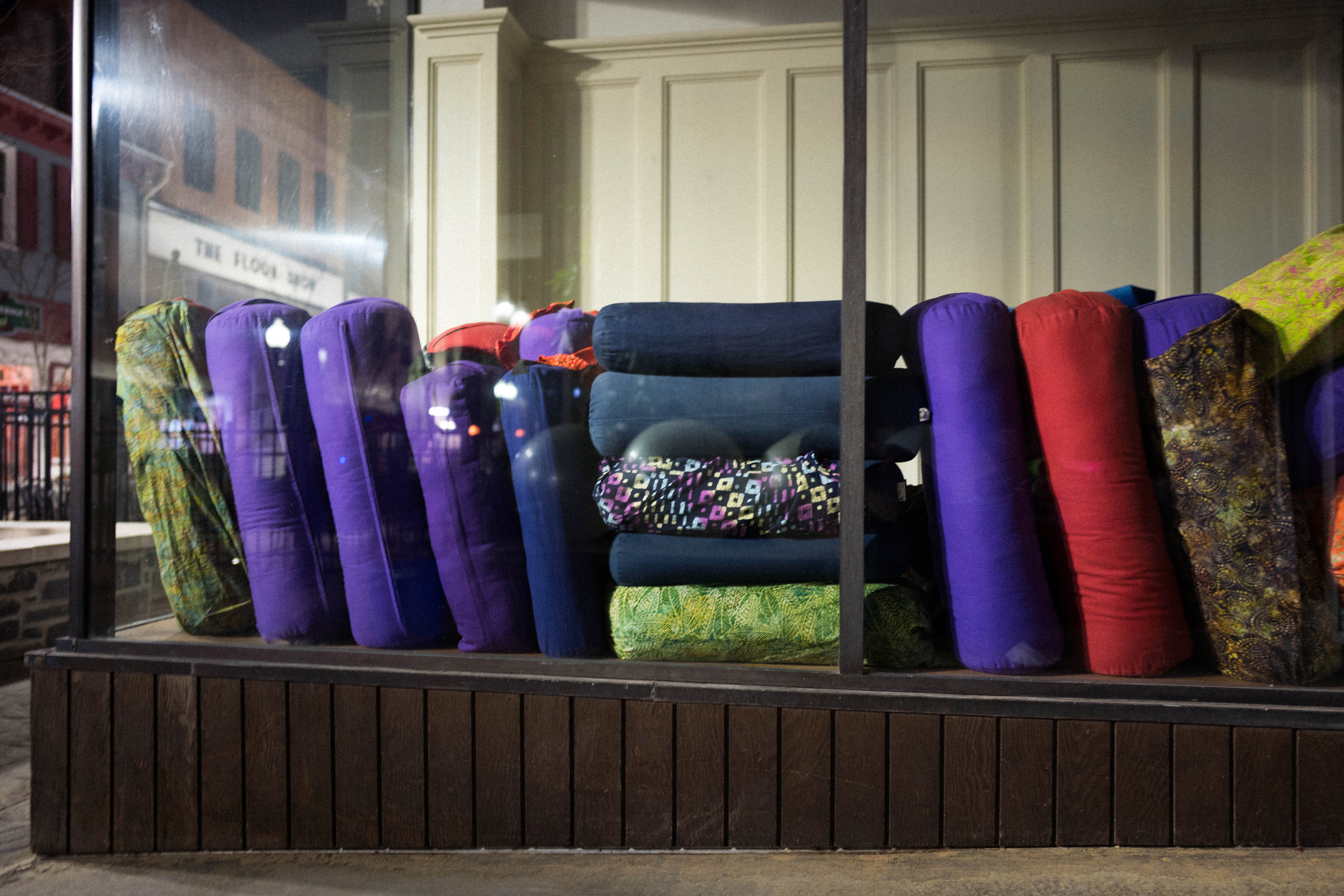 This photograph captures a display of vibrant pillows stacked neatly in a storefront window, illuminated by soft night lighting. The composition showcases a harmonious arrangement of colors, inviting a sense of comfort and warmth amidst the cool night air. Reflections in the glass add an intriguing layer, connecting the display to the outside world and enhancing the tranquil mood.
