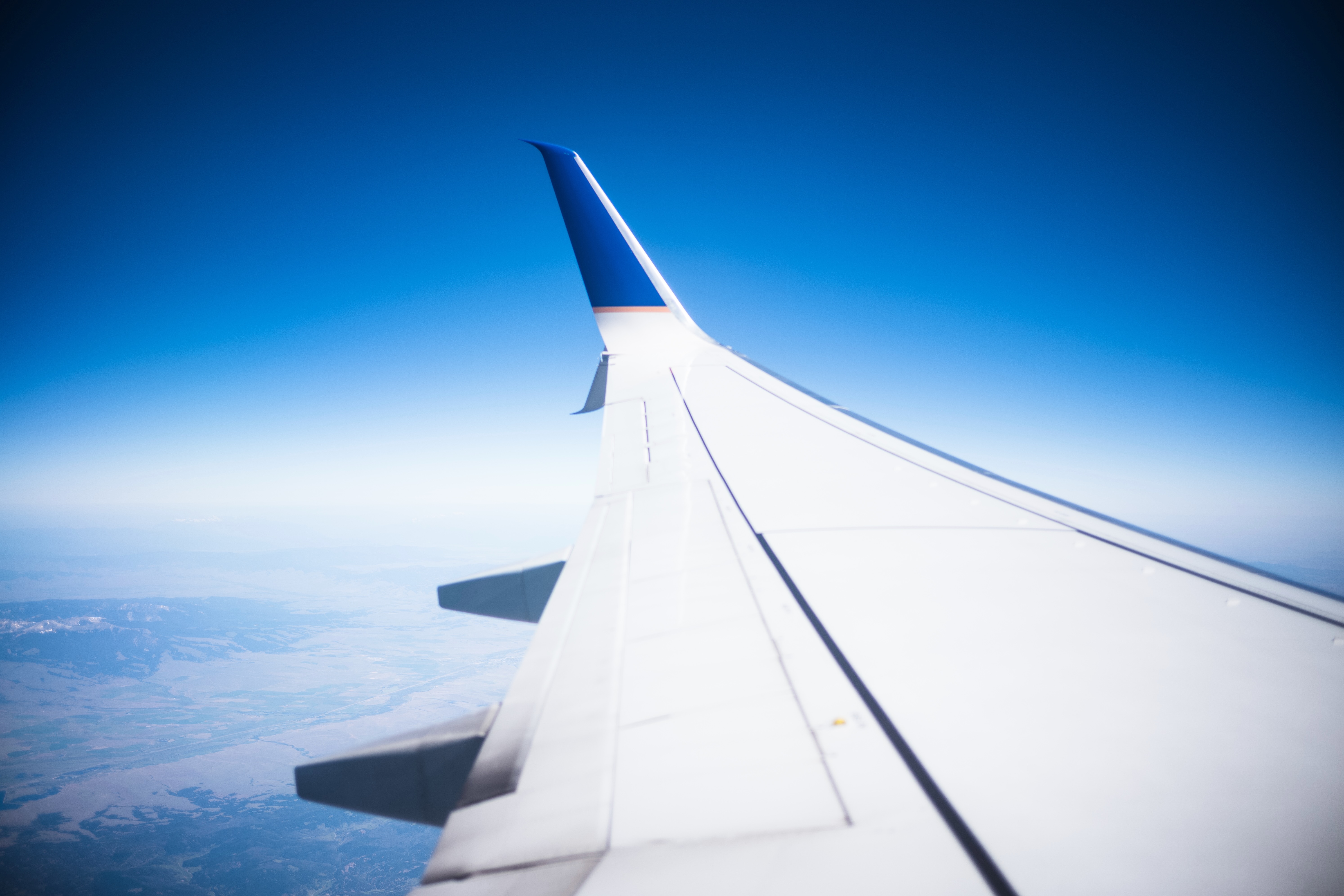 This photograph captures the wing of an airplane slicing through a clear blue sky, evoking a sense of freedom and adventure. The horizon below presents a soft, expansive landscape that fades into the distance, enhancing the feeling of elevation and distance from the mundane. The bright, natural lighting highlights the details of the wing, inviting a sense of serenity and exploration.
