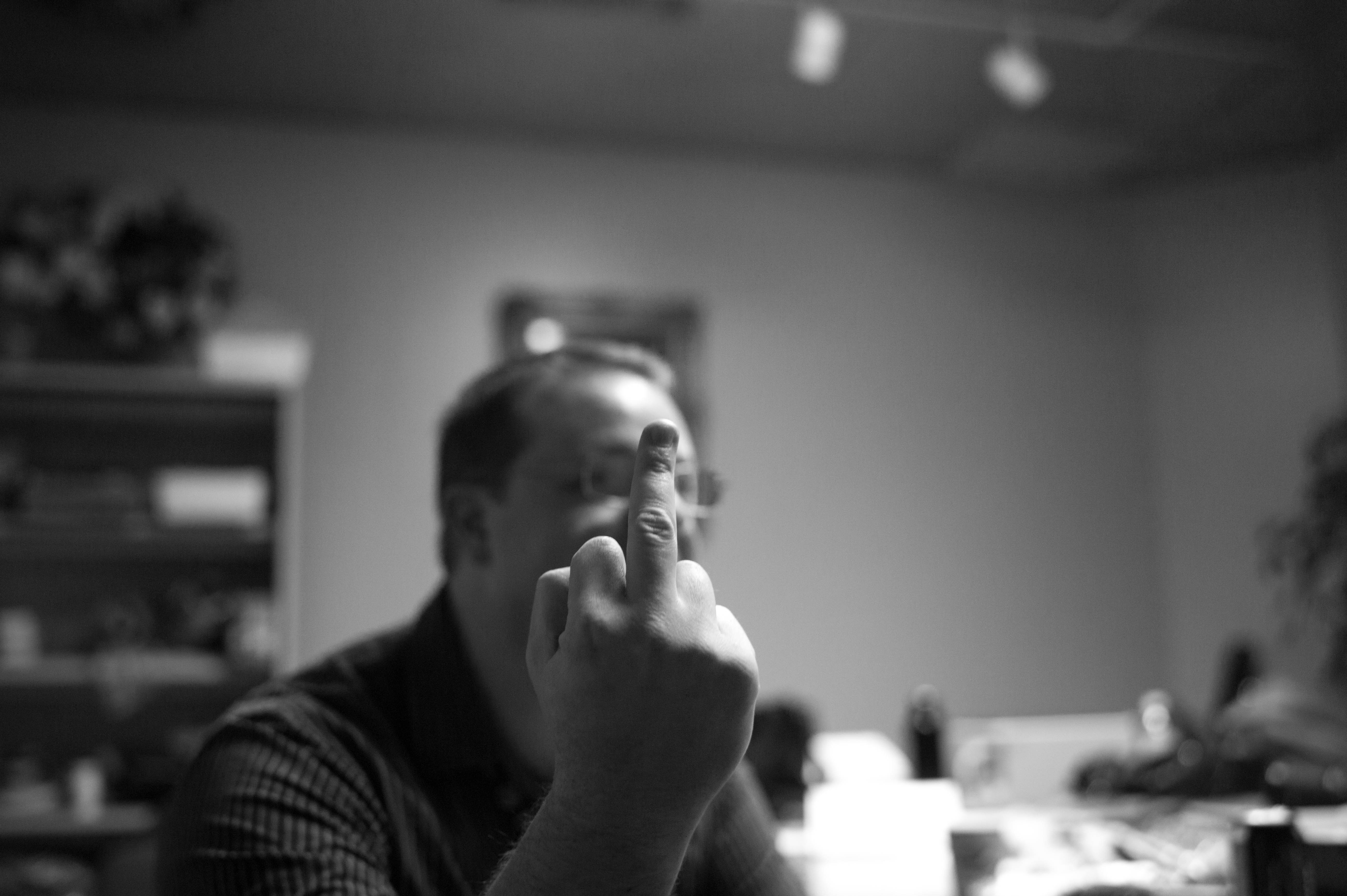 In this striking black-and-white photograph, a man extends his middle finger towards the viewer, conveying a mood of defiance or rebellion. The blurred background and subdued lighting draw focus to his gesture, while the soft contrasts create a poignant yet confrontational atmosphere. The composition effectively captures an intimate moment filled with raw emotion and unspoken sentiment.