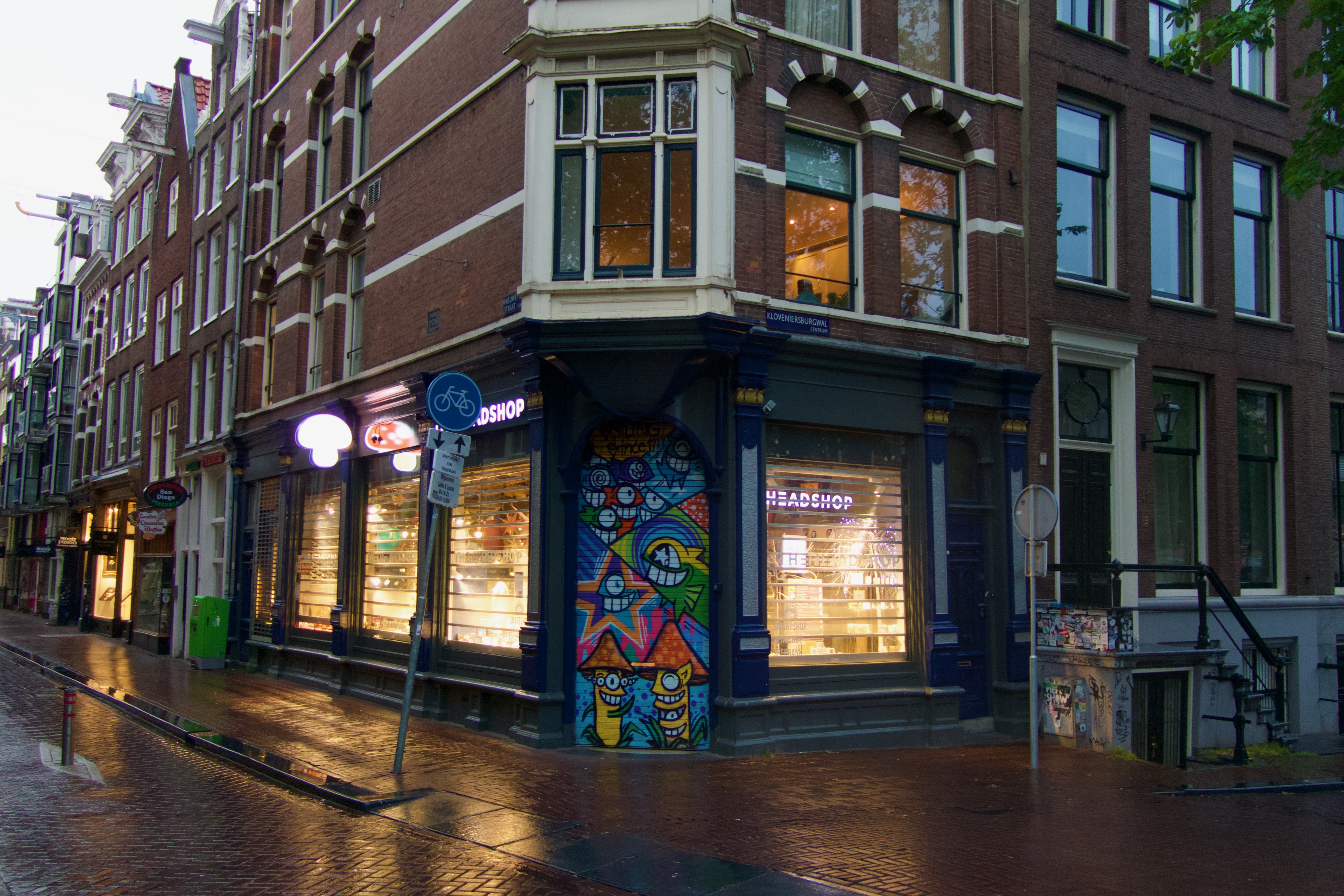 This photograph captures a vibrant corner shop in a quaint Amsterdam street, with a striking mural adding color to the rustic architecture. The warm glow from the shop windows contrasts with the wet, reflective pavement, creating an inviting yet moody atmosphere. The overall composition draws the viewer’s eye to the intersection of modern culture and historical charm, enhanced by soft, ambient lighting.