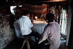 In a dimly lit room, two men sit at a simple wooden table adorned with a tablecloth and nestled among candles and flowers. The soft, earthy tones of the scene evoke a sense of intimacy and contemplation, with the flickering candlelight casting gentle shadows that dance upon the rustic walls.