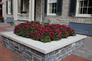 A vibrant cluster of pink flowers fills a stone planter, creating a heartwarming focal point against a backdrop of rustic buildings. The soft, diffuse light enhances the lush greenery and vivid blooms, evoking a serene and inviting atmosphere. This charming scene captures the harmonious blend of nature and urban life, inviting passersby to pause and appreciate its beauty.