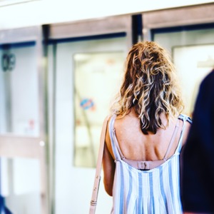 A woman with curly hair walks away, her back exposed in a soft striped dress. The lighting casts a gentle glow, creating an intimate yet fleeting moment. The blurred background hints at a busy environment, amplifying the sense of solitude amidst the crowd.