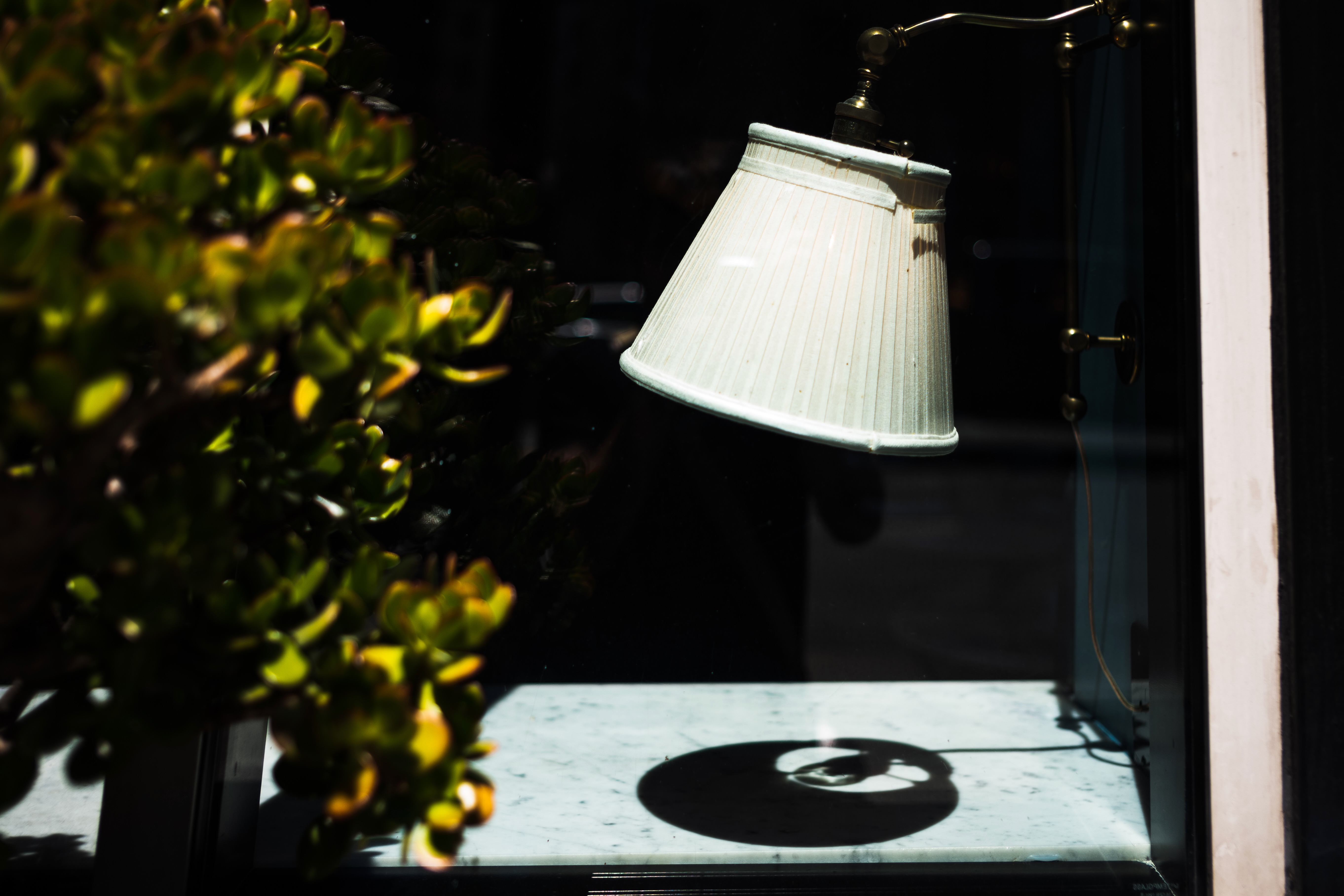 The photograph captures a simple, elegant lamp with a pleated shade, suspended in a shop window, framed by lush greenery. Soft, natural light casts a delicate shadow onto the marble surface below, creating a tranquil and contemplative mood. The contrast between light and shadow invites the viewer to pause and appreciate the momentary beauty of everyday objects.