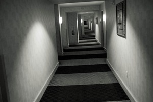 The photograph captures a stark hotel corridor, bathed in muted grayscale tones. Soft lighting along the walls casts elongated shadows, enhancing the sense of isolation and quietness. The patterned carpet draws the eye down the seemingly endless passage, evoking a feeling of both intrigue and unease.