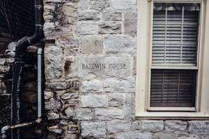 The photograph captures a weathered stone wall of the Baldwin House, with the name elegantly etched into the surface. The muted tones and soft lighting evoke a sense of nostalgia, while the neatly framed window hints at stories and memories held within. The juxtaposition of natural textures and architectural lines creates a contemplative mood, inviting exploration of the past.