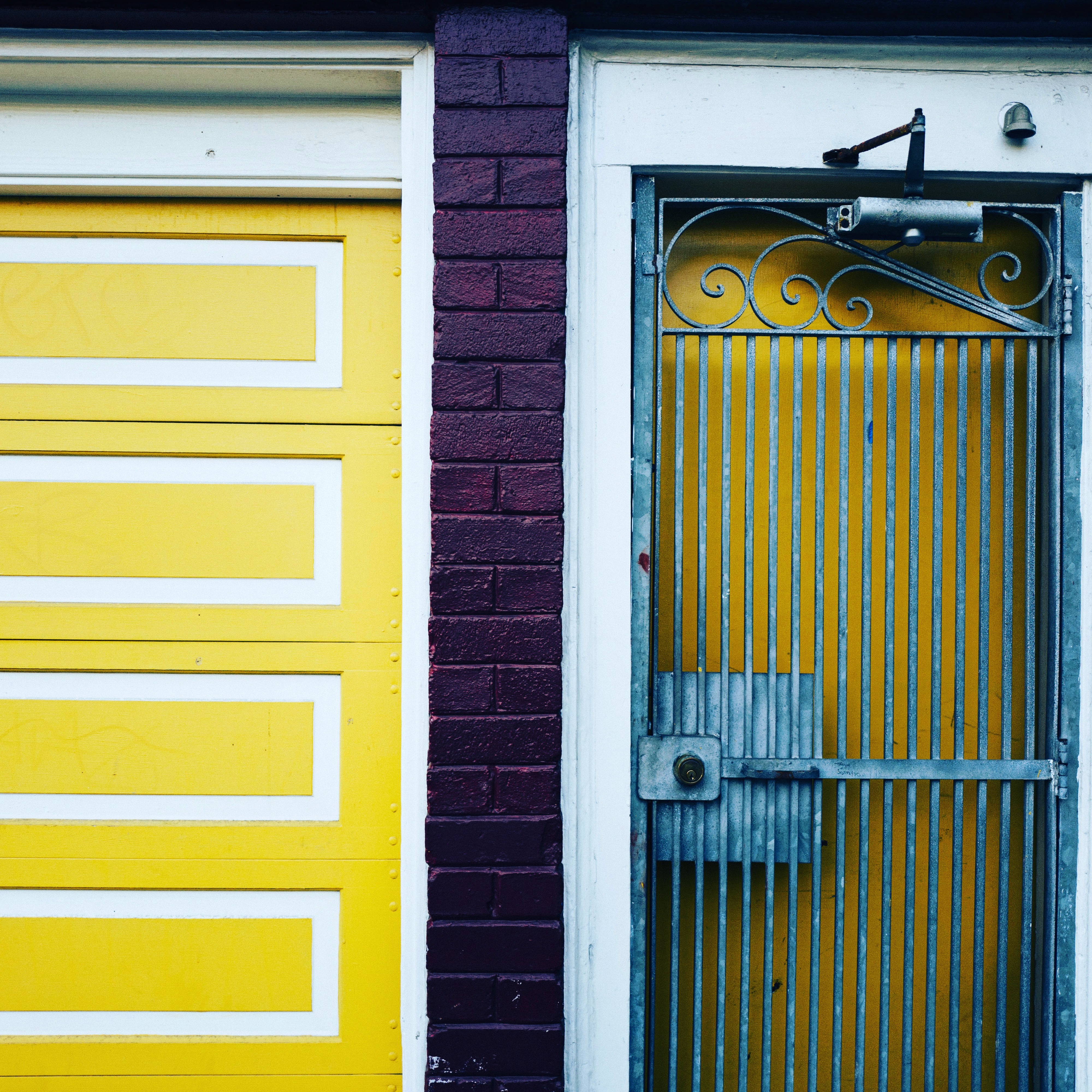 This photograph captures a striking juxtaposition between a bright yellow garage door and a rustic metal gate, framed by rich purple brick. The vibrant hues evoke a playful yet gritty urban atmosphere, while the composition emphasizes the textures and lines of both structures. Subtle lighting hints at a moody ambience, inviting contemplation of the stories behind these contrasting elements.