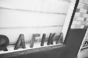 This photograph captures a close-up of slightly weathered metal letters spelling 'RAFIKA' against a backdrop of raindrop-streaked glass. The black and white composition adds a sense of nostalgia and melancholy, as muted tones create a moody atmosphere. The interplay of light and shadow accentuates the textures, inviting a contemplation of time and memory.