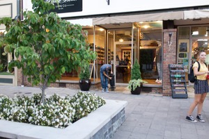 The photograph captures a bustling storefront scene, where an employee tends to tasks outside while a passerby lingers nearby. The warm, inviting glow of the shop contrasts with the twilight atmosphere, enhancing a sense of community. The composition is alive with greenery and vibrant storefronts, evoking a mood of casual urban life and connectivity.