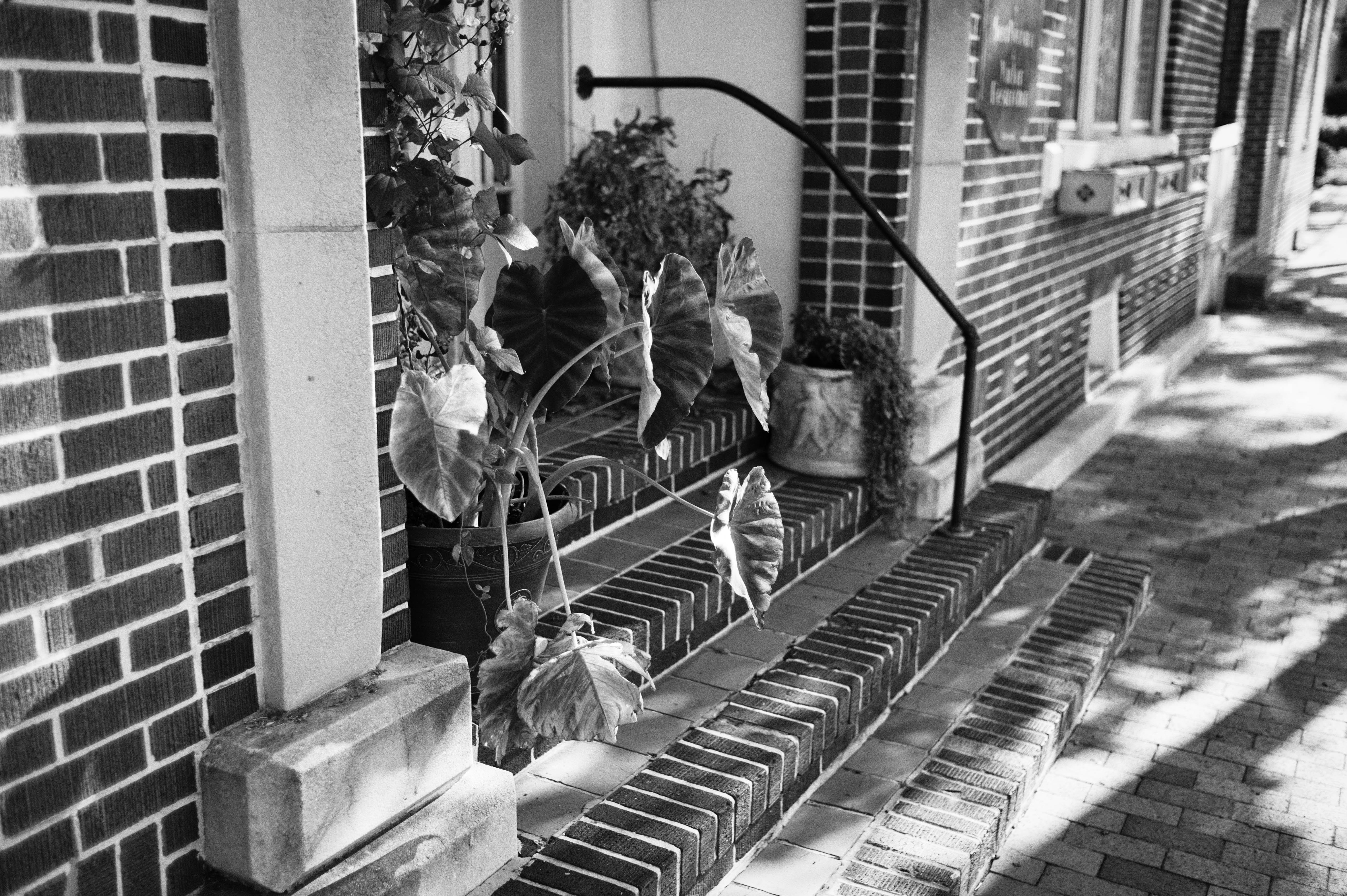 The photograph captures a serene entrance framed by textured brick walls and lush foliage. In monochrome, light and shadow dance over the steps, highlighting the curved handrail and the large leaves that add a touch of nature's elegance. The overall mood evokes a sense of peaceful solitude, inviting viewers to linger in this intimate moment.
