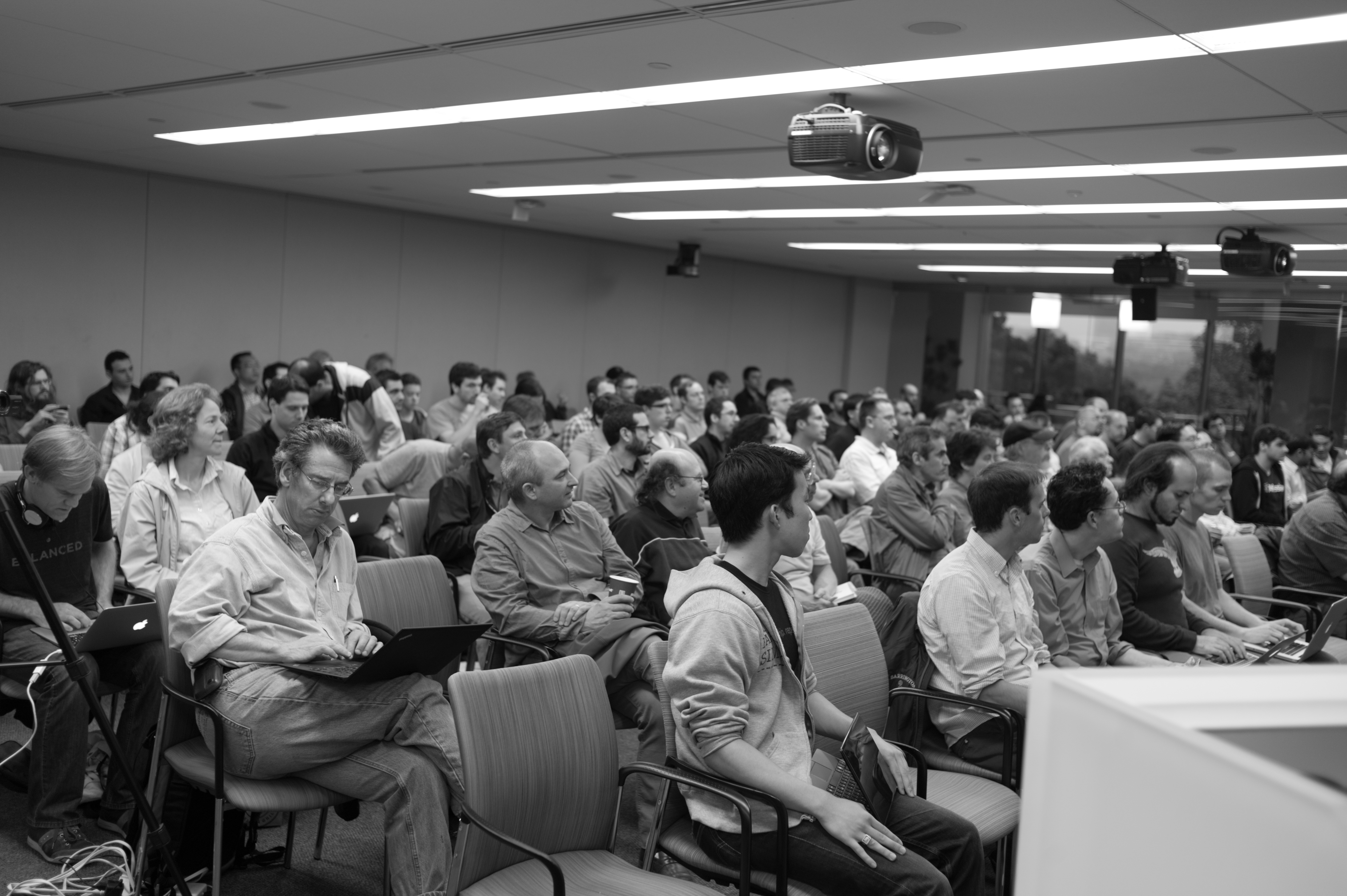 In a spacious conference room, a diverse group of attendees sits attentively, absorbed in a presentation. The monochromatic tone enhances the seriousness of the atmosphere, while the arrangement of seats creates a sense of unity. Soft overhead lighting casts gentle shadows, further emphasizing the focused expressions on the participants' faces.